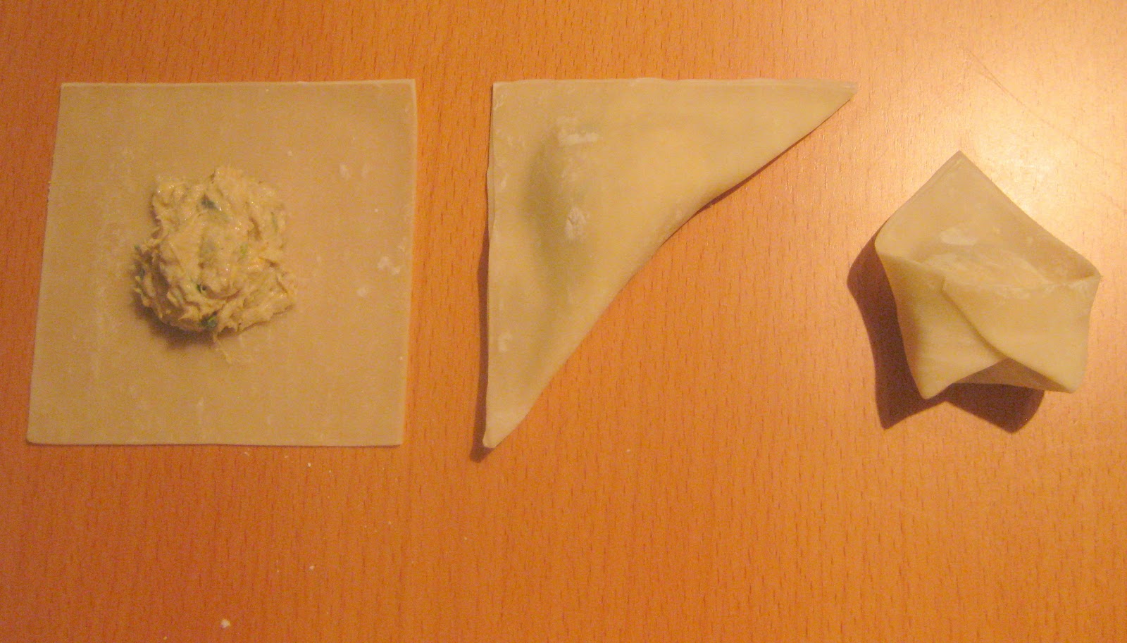 - Using your finger, wet two of the edges of the wrapper and then fold over the other two edges to form a triangle. Press down all along the edges to form a seal so that no filling can escape.